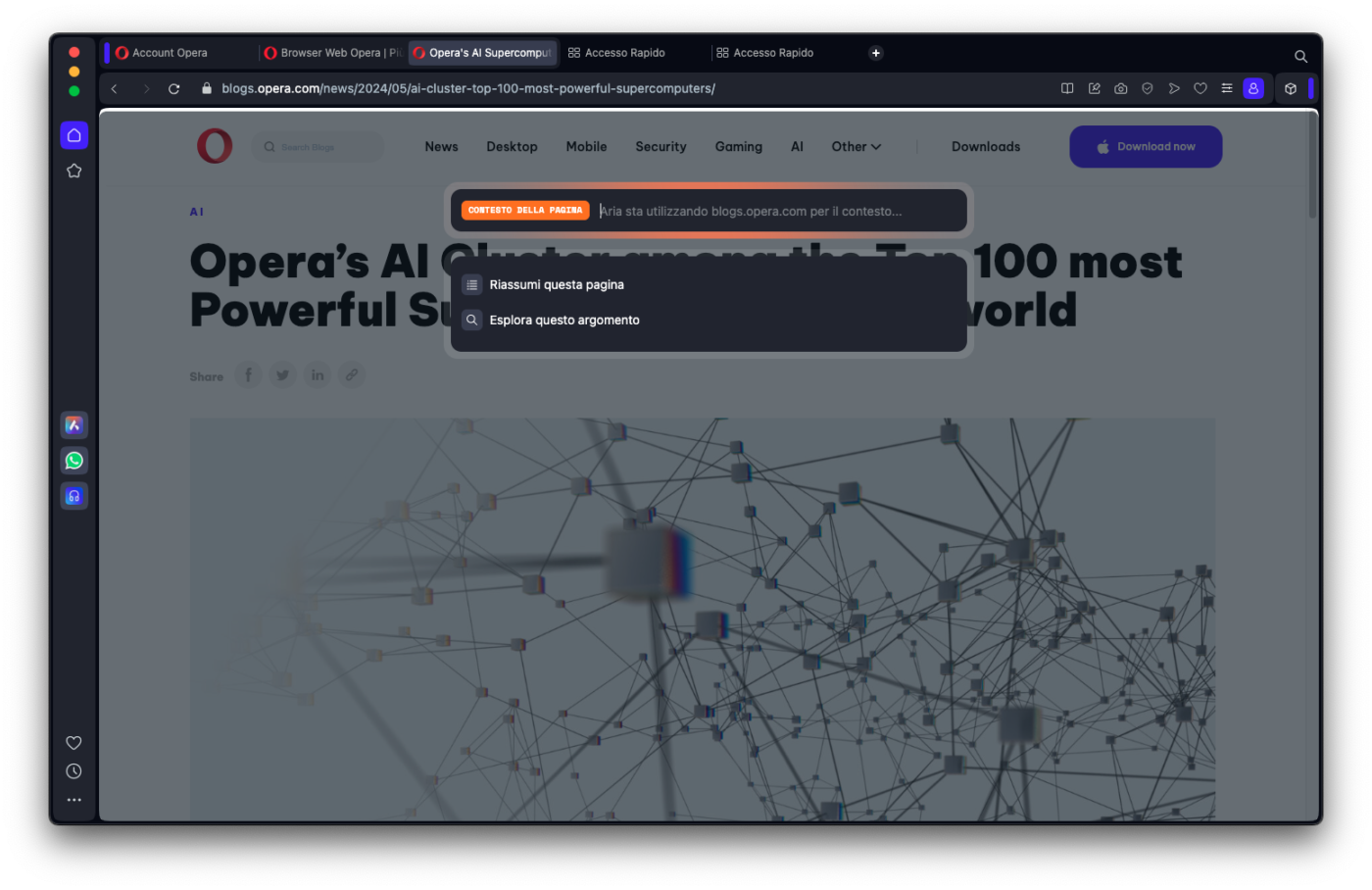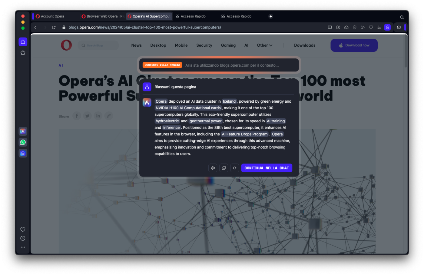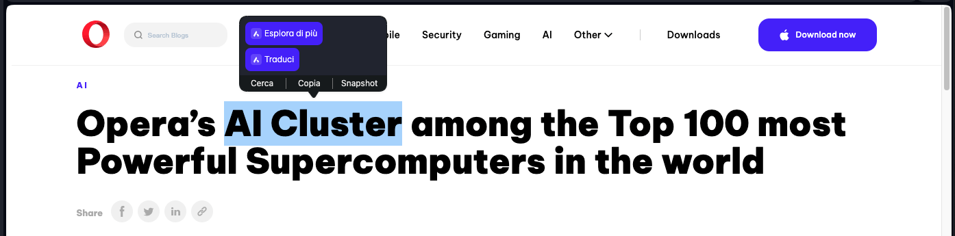 Vediamo allora come si usa l’AI integrata in Opera, ricordando che l’interfaccia utente conoscerà un redesign nella imminente nuova major release.