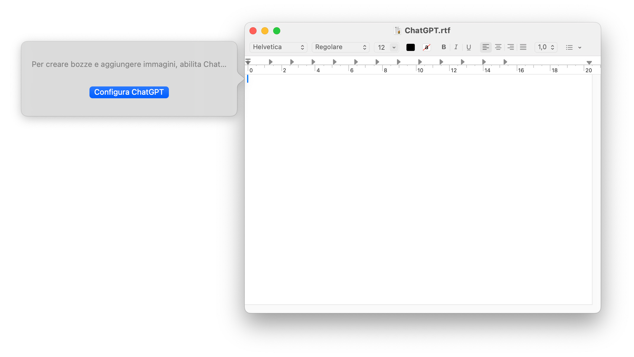 Riprendiamo dunque quell’esempio, con TextEdit. Scegliendo Modifica > Strumenti di scrittura > Scrivi, o accedendo al menu facendo clic con il pulsante destro del mouse o ctrl + clic nel documento e selezionando Scrivi, la prima volta che utilizziamo l’integrazione con ChatGPT macOS ci chiederà di eseguire la configurazione per abilitarla.