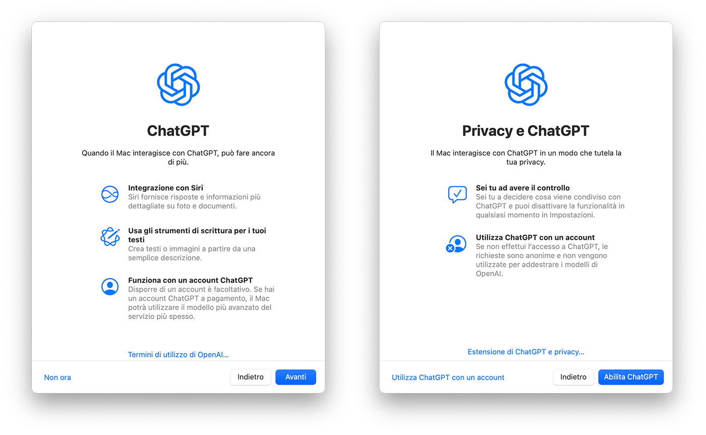 Facendo clic su Configura ChatGPT, si avvia la procedura per abilitare l’estensione: una prima finestra ci informa che, configurando l’assistente di OpenAI, possiamo sfruttare l’integrazione con Siri, abilitiamo la creazione di testi o immagini usando gli Strumenti di scrittura e accediamo a ulteriori opzioni avanzate se colleghiamo un nostro account ChatGPT eventualmente attivo.