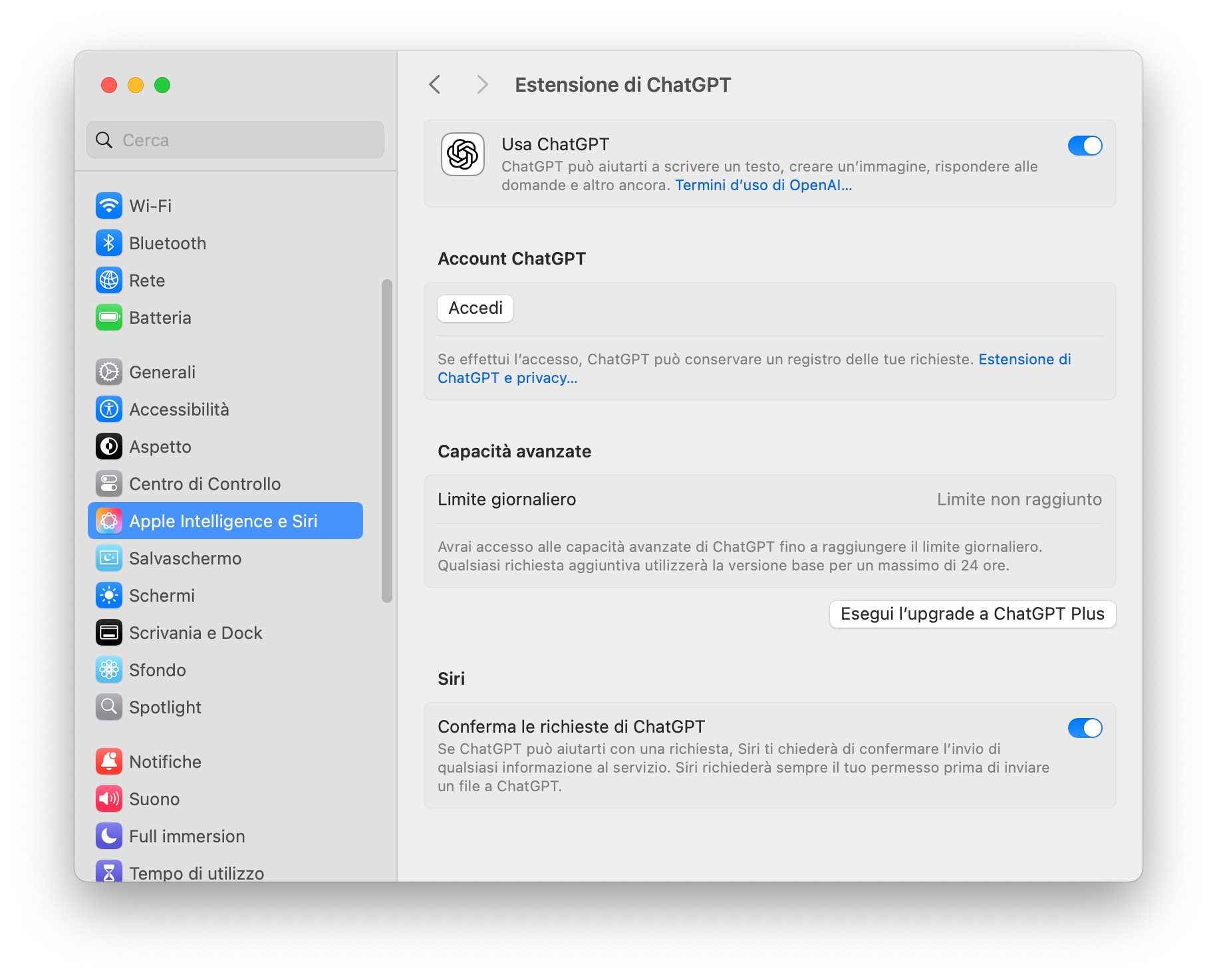 In ogni momento, dunque, possiamo disattivare l’estensione ChatGPT o accedere con il nostro account OpenAI. Abilitare l’estensione attiva l’integrazione di ChatGPT con Siri e con gli Strumenti di scrittura di Apple Intelligence.