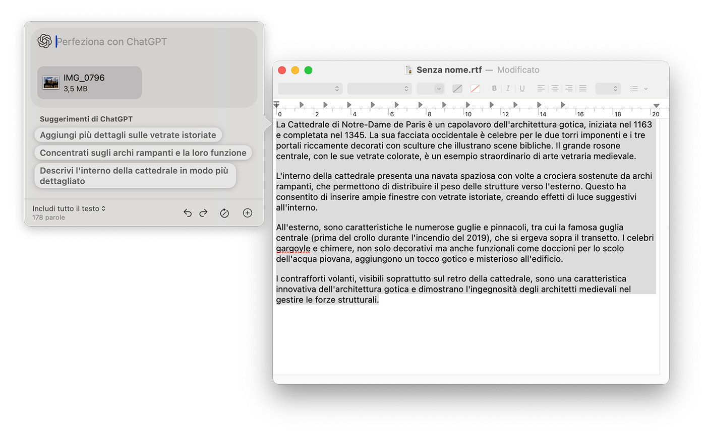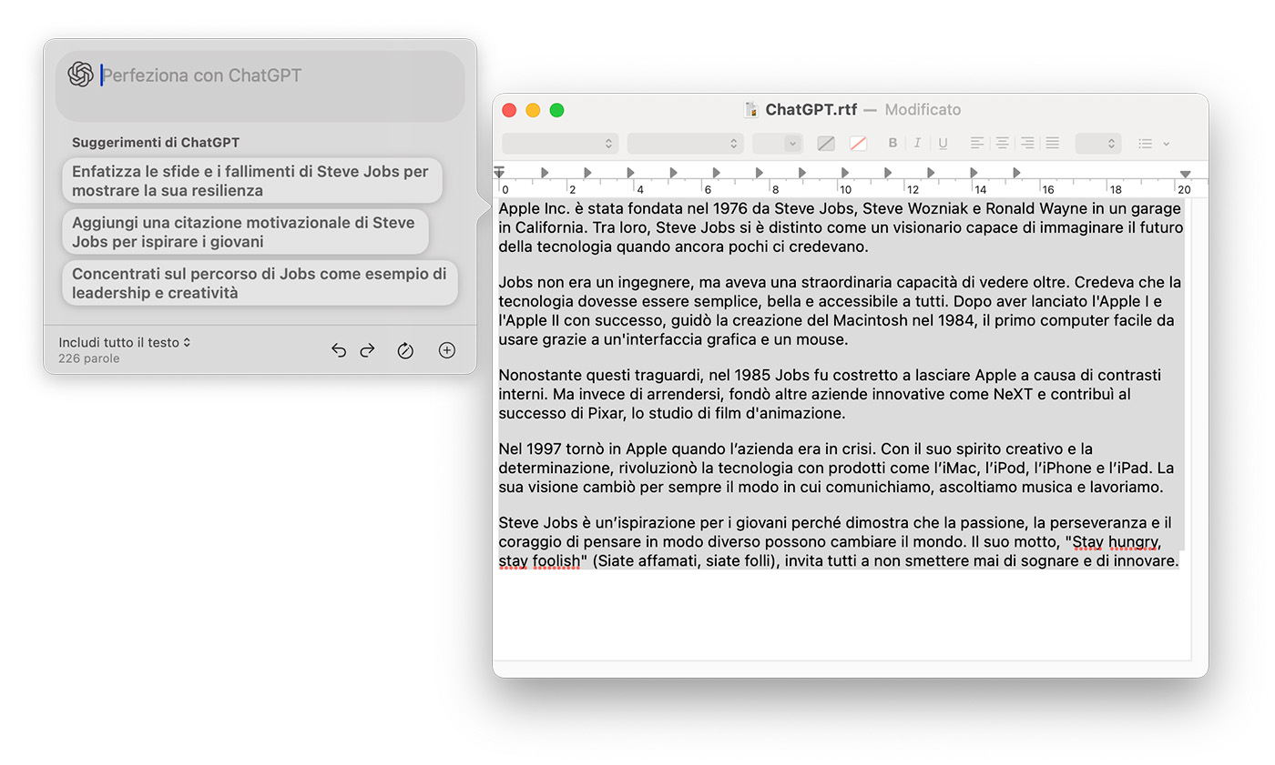 E, chiaramente, l’applicazione Mac deve offrire il supporto per gli Strumenti di scrittura di Apple Intelligence, che a loro volta integrano l’estensione di ChatGPT.