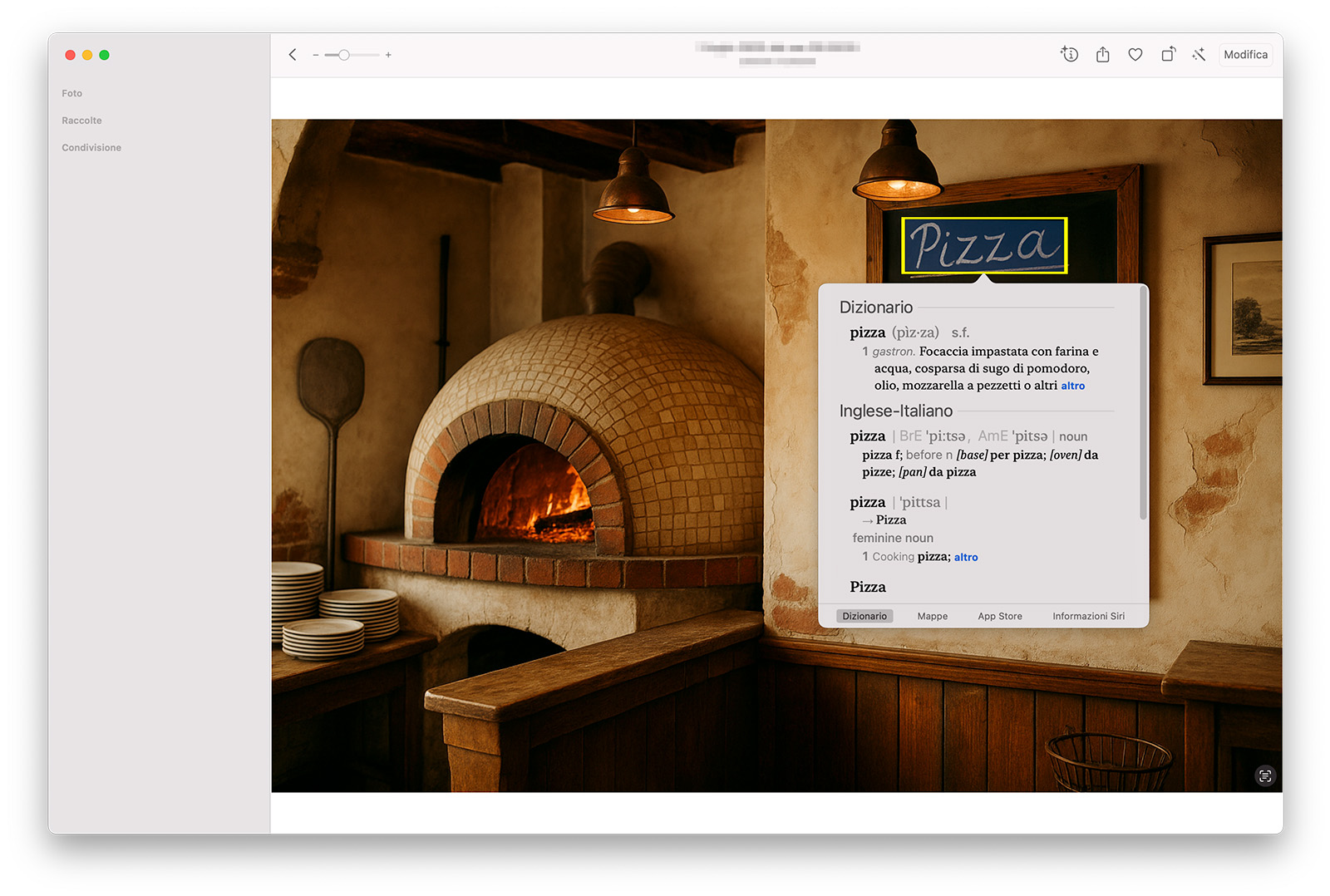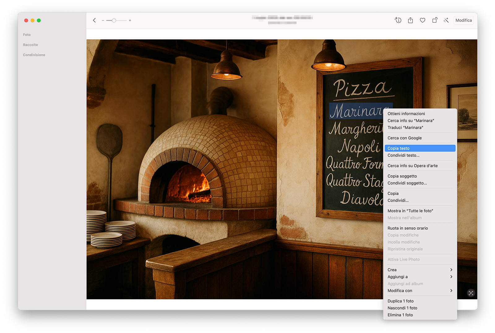 Dicevamo che il tutto avviene in modo fluido e trasparente. Per usare la funzione Testo attivo, innanzitutto apriamo una delle applicazioni che la supportano: in questo nostro primo esempio, utilizziamo Foto del Mac.