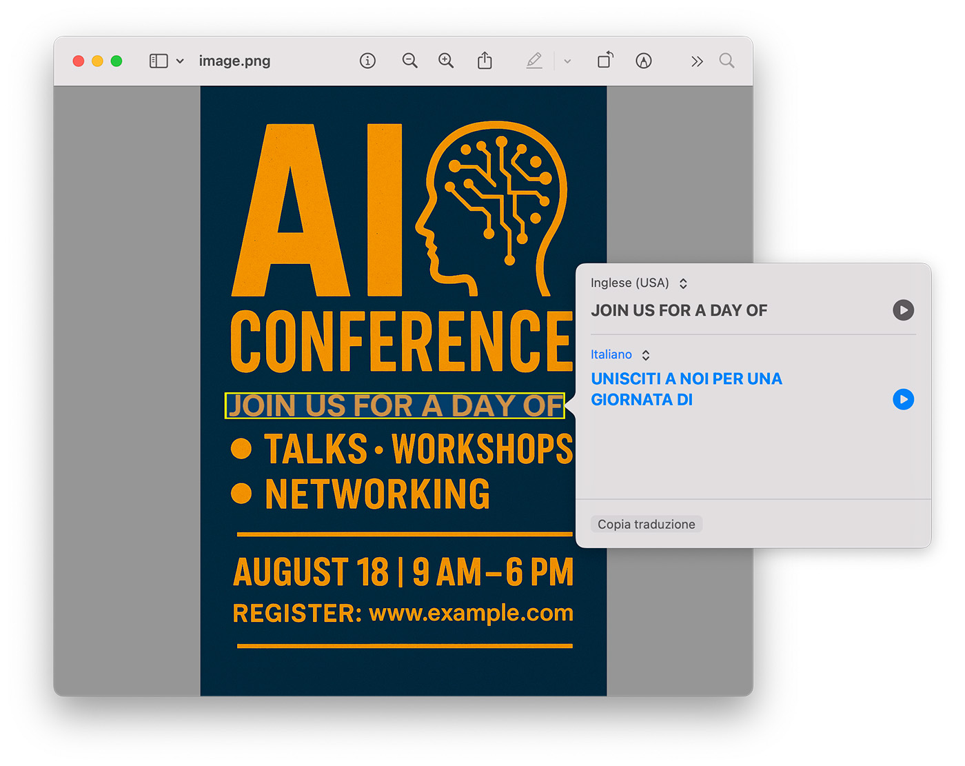 Possiamo tradurre il testo selezionato (Traduci “testo selezionato”) – opzione molto utile per interpretare testi in lingue straniere presenti nelle immagini – oppure cercare il suo significato o informazioni su di esso (Cerca info su “testo selezionato”) con la funzione di ricerca di macOS.