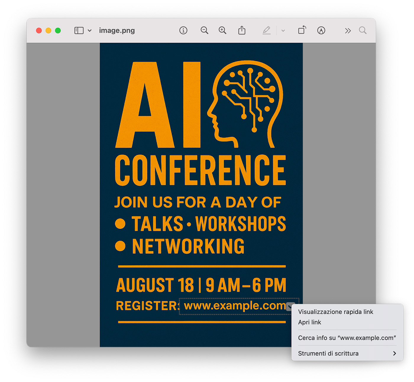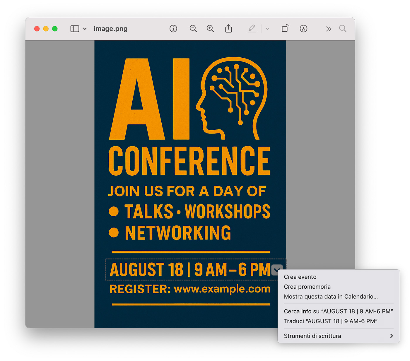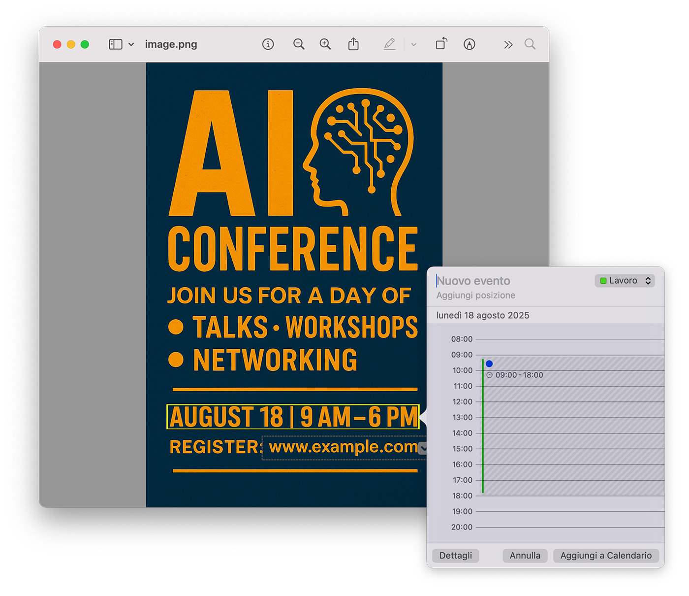 Ad esempio, selezionando Crea evento, la funzionalità Testo attivo si occuperà di riconoscere la data e di pre-compilare un evento per il Calendario del Mac, con le informazioni che è riuscita ad estrapolare dal testo selezionato.