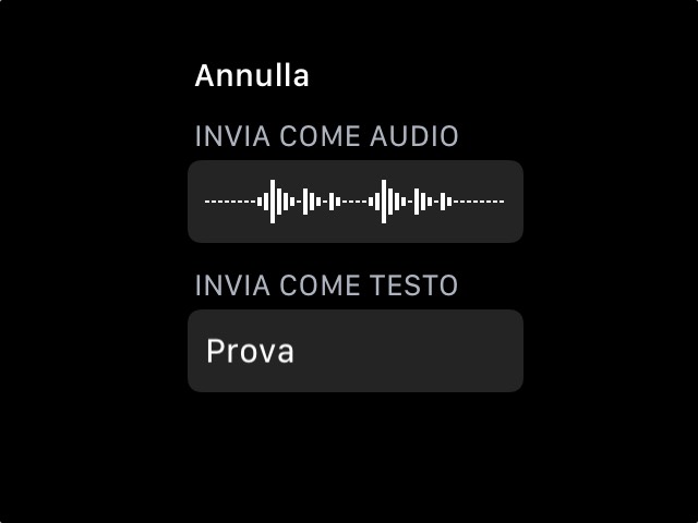 Terminato il messaggio vocale, con le impostazioni che abbiamo scelto Apple Watch ci chiederà se vogliamo inviarlo appunto come parlato (Invia come audio) o come trascrizione (Invia come testo). La scelta sta a noi fino all’ultimo momento. A questo punto si tratta semplicemente di toccare il pulsante corrispondente.