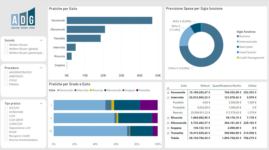 La gestione del budget offre potenti metriche di confronto per la gestione dei costi del dipartimento Legale. Un avanzato sistema di registrazione e monitoraggio rende sempre disponibile un confronto sinottico tra Actual (con valore residuo disponibile) e Impegnato (previsioni di spese sugli incarichi e sulle sopravvenienze), con aggiornamento automatico dei costi attraverso l’integrazione con i sistemi contabili in house.