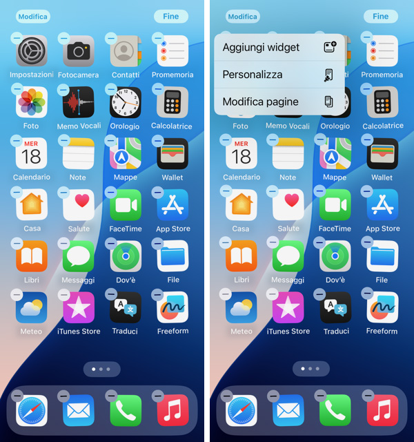 Innanzitutto, premiamo e teniamo premuto su uno spazio libero della schermata Home: le icone delle app inizieranno a vibrare e, nella parte superiore, iOS mostrerà i pulsanti Modifica e Fine.