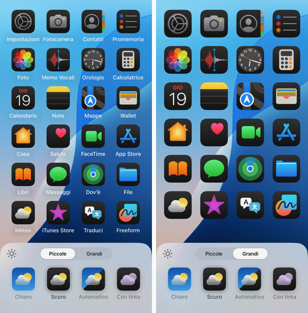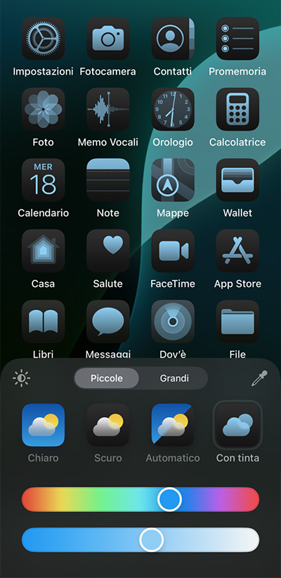Nel pannello di personalizzazione che si apre nella parte inferiore della schermata possiamo selezionare l’aspetto che desideriamo per le icone delle app e i widget, tra Chiaro e Scuro, indipendentemente dalla modalità selezionata per iOS.
