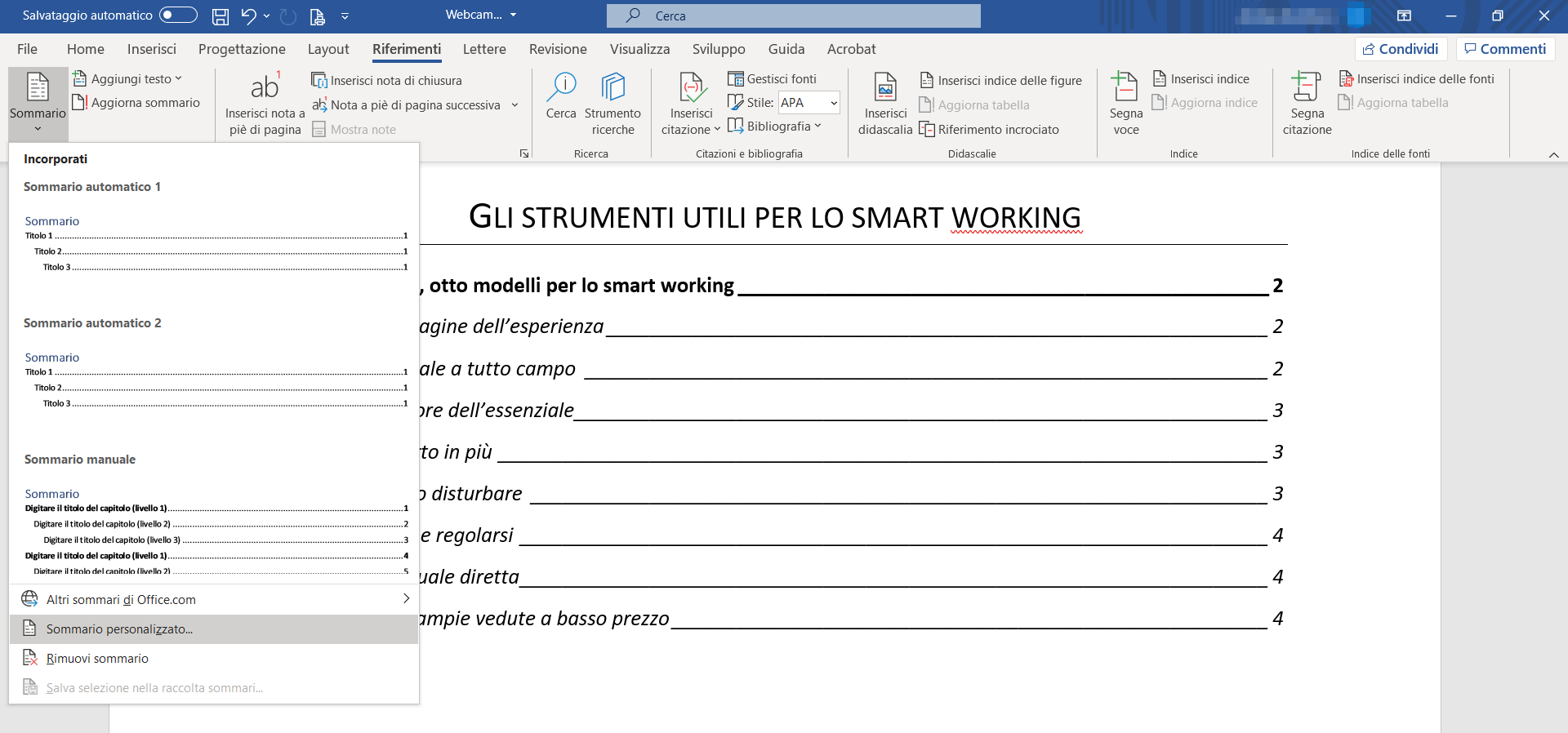 Partiamo di nuovo dalla scheda Riferimenti della barra multifunzione di Word e dal pulsante Sommario: questa volta, però, dal menu di opzioni selezioniamo la voce Sommario personalizzato.