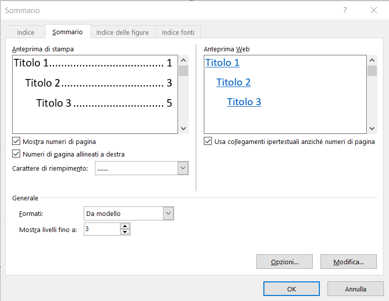 Abbiamo innanzitutto due riquadri di anteprima, una di stampa e l’altra web, per verificare l’effetto visivo sul sommario delle modifiche che stiamo impostando. L’Anteprima Web, con l’opzione Usa collegamenti ipertestuali anziché numeri di pagina, è utile se dovremo esportare in HTML il documento.