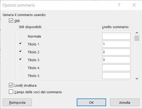 Facendo clic sul pulsante Opzioni si apre una ulteriore finestra di dialogo, Opzioni sommario: qui, possiamo visualizzare e assegnare gli Stili disponibili nel documento ai rispettivi livelli del sommario.