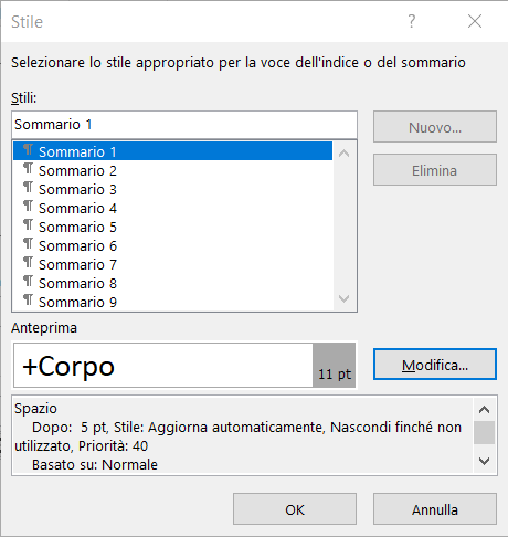 Oltre a Opzioni (e ai consueti OK e Annulla per confermare o annullare le modifiche), nella finestra di dialogo Sommario è presente anche il pulsante Modifica. Questo apre una finestra di dialogo in cui è possibile visualizzare e, se lo si desidera, modificare gli stili utilizzati da Word per le voci del sommario.