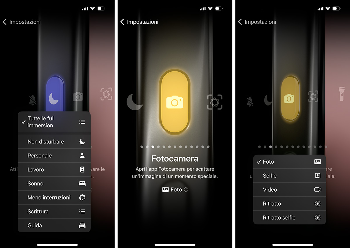 Ad esempio, l’opzione Full immersion ci consente di scegliere la specifica full immersion da attivare. Mentre l’azione Fotocamera permette di selezionare la modalità da attivare (Foto, Selfie, Video e così via).