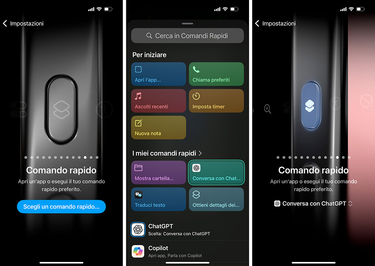 Ad esempio, l’opzione Comando rapido mostra il pulsante Scegli un comando rapido. Un tocco su di esso apre un pannello per sfogliare o cercare in Comandi rapidi quello che ci interessa abbinare alla pressione del tasto Azione di iPhone.