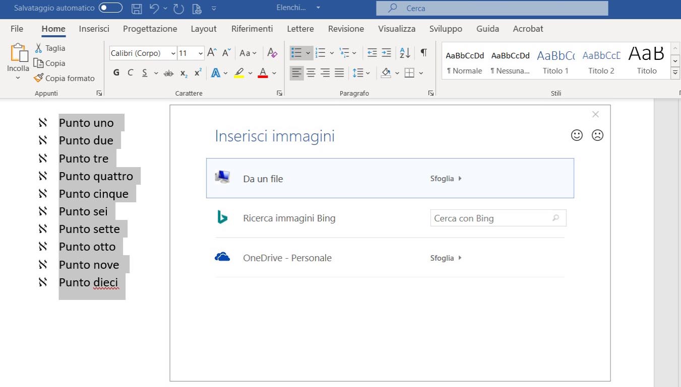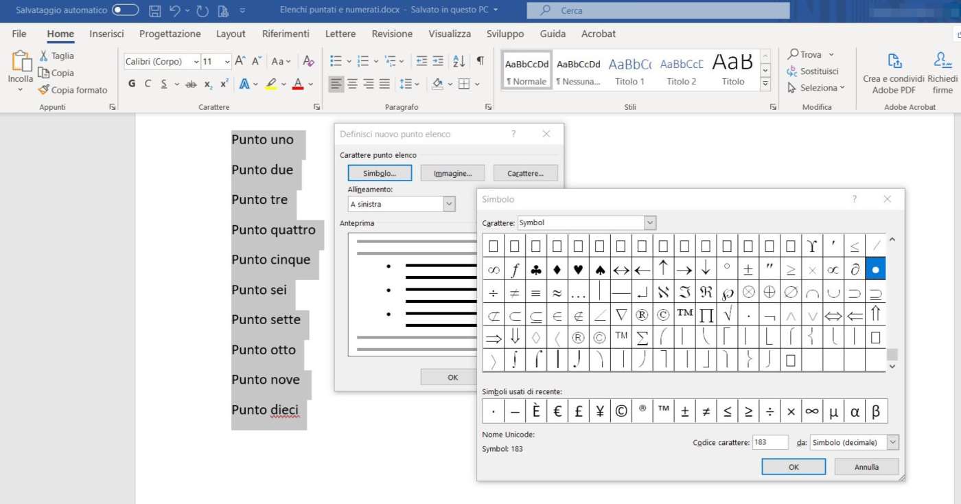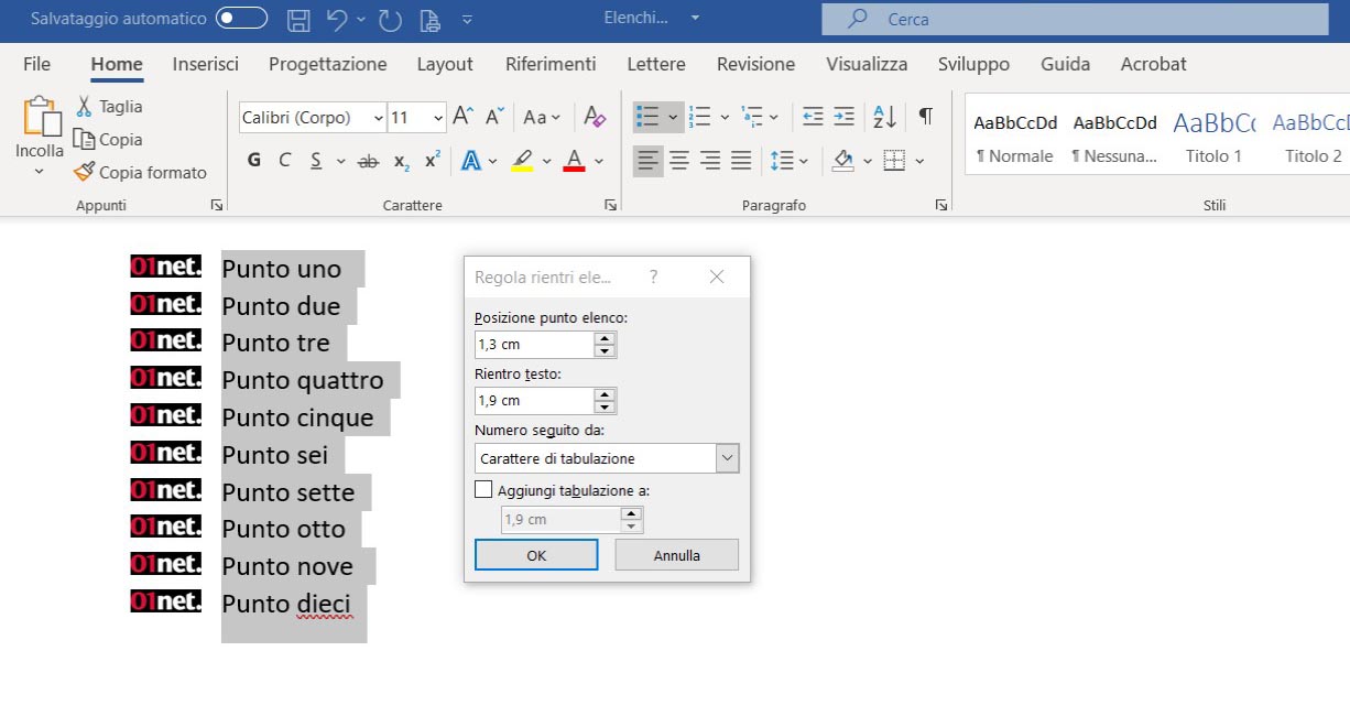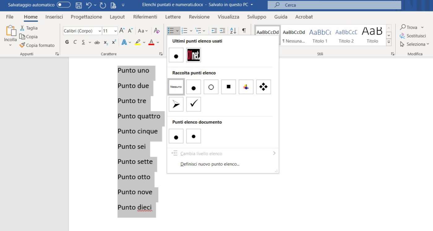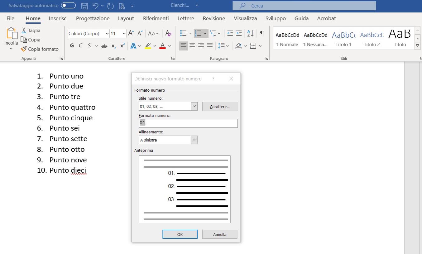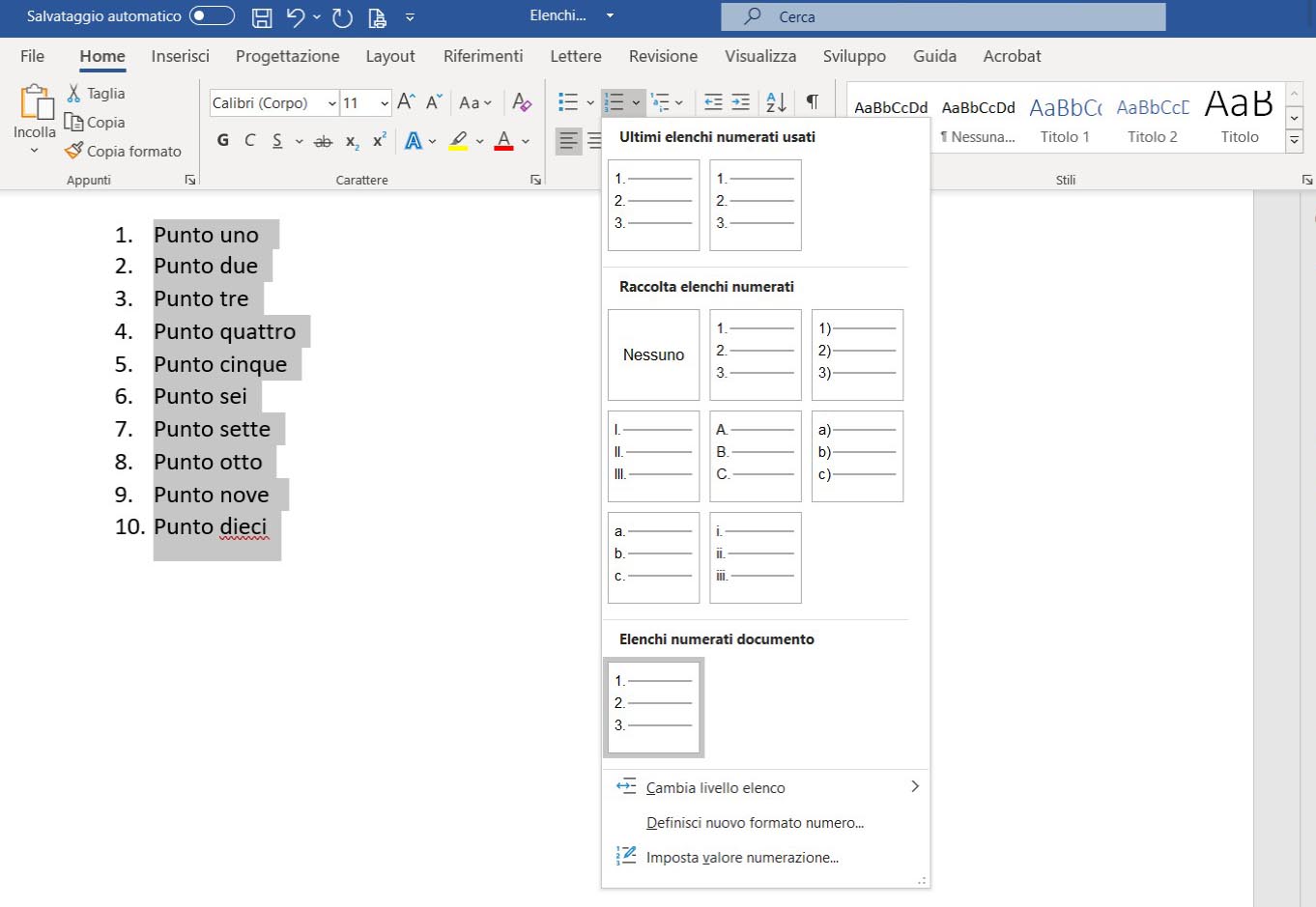 Per gli elenchi numerati le operazioni da fare sono analoghe, tranne che nelle liste di questo tipo per definizione ogni punto elenco è definito da un numero.