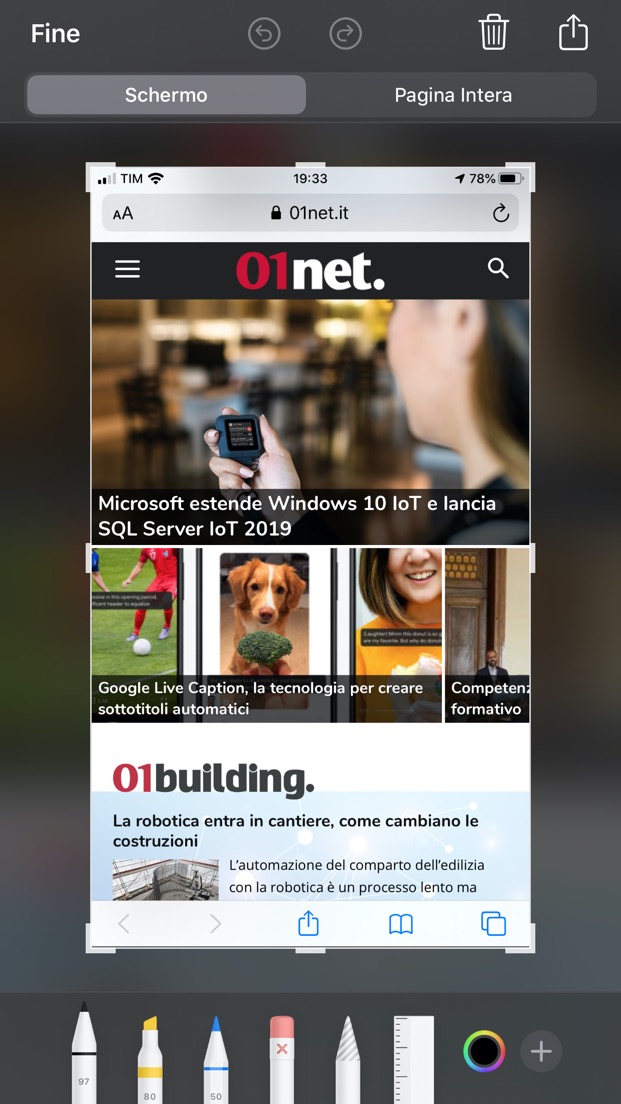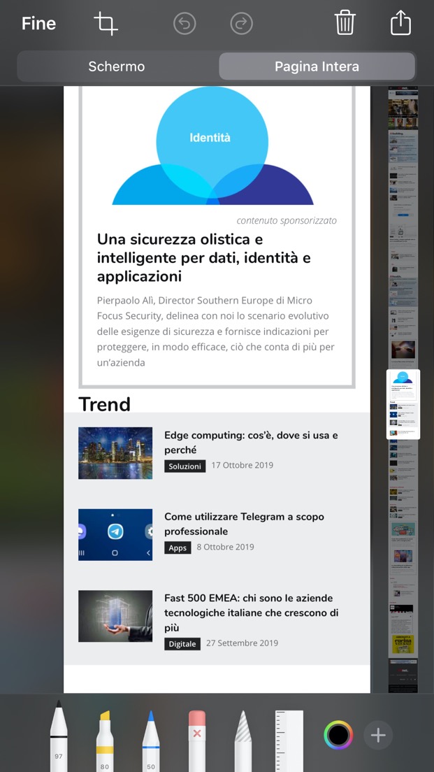 Screenshot Safari iOS• Tocca Pagina intera nella schermata di editing dell’istantanea dello schermo.