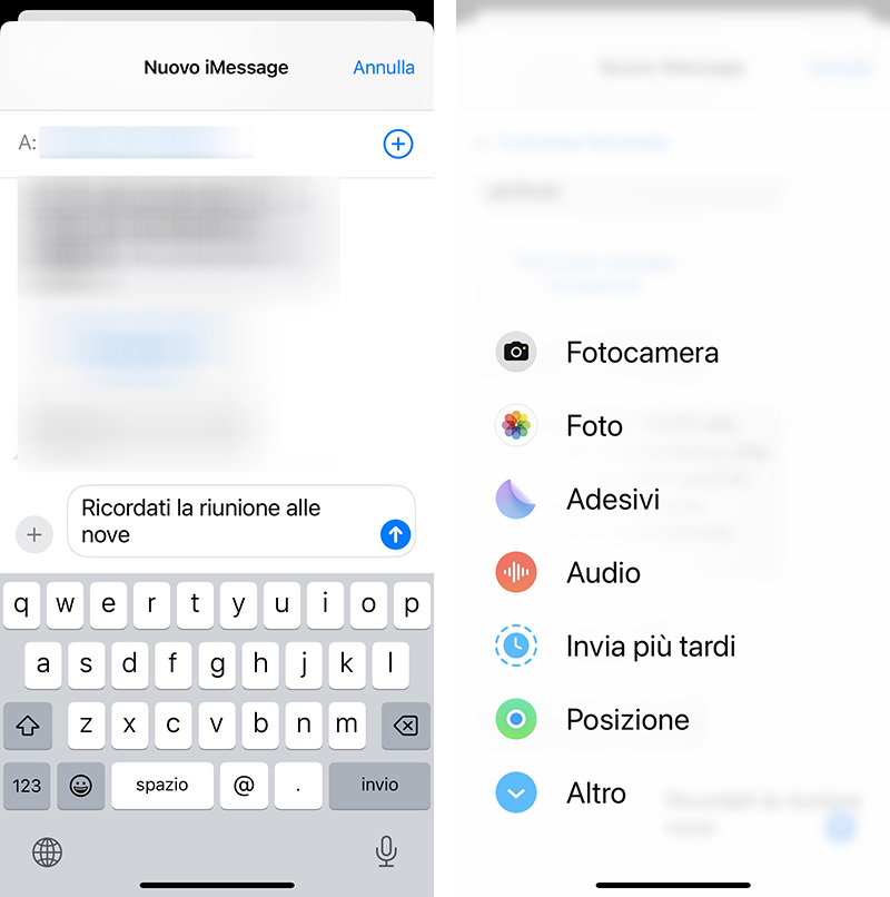 Nel menu che si apre con un tap sul pulsante App (in cui troviamo numerose opzioni per allegare contenuti), tocchiamo sul comando Invia più tardi.