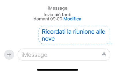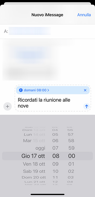 Al di sotto del campo di testo, il familiare scheduler di iOS ci consente di impostare il giorno e l’orario in cui il messaggio dovrà essere inviato. L’unica limitazione è che la data di invio non può essere pianificata con un anticipo superiore ai 14 giorni.