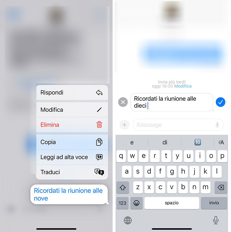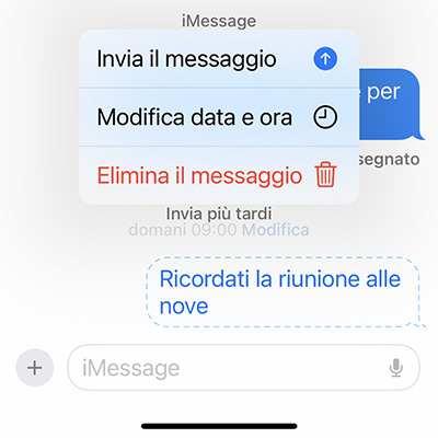 Nella finestra della conversazione, l’app Messaggi di iOS 18 non solo mostra i messaggi pianificati e non ancora inviati con un aspetto diverso: indica anche l’orario di invio programmato e presenta un link Modifica. Infatti, finché il messaggio non viene inviato, possiamo sempre riprogrammare la data e l’ora, modificarlo o eliminarlo.