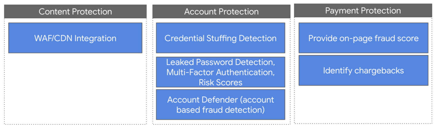 Riconoscendo il bisogno delle aziende di una soluzione integrata per le frodi, il team di reCaptcha Enterprise sta lavorando per costruire un set completo e integrato di strumenti per difendersi dalle frodi lungo tutto il percorso: da una pageview, al login, fino al pagamento finale.