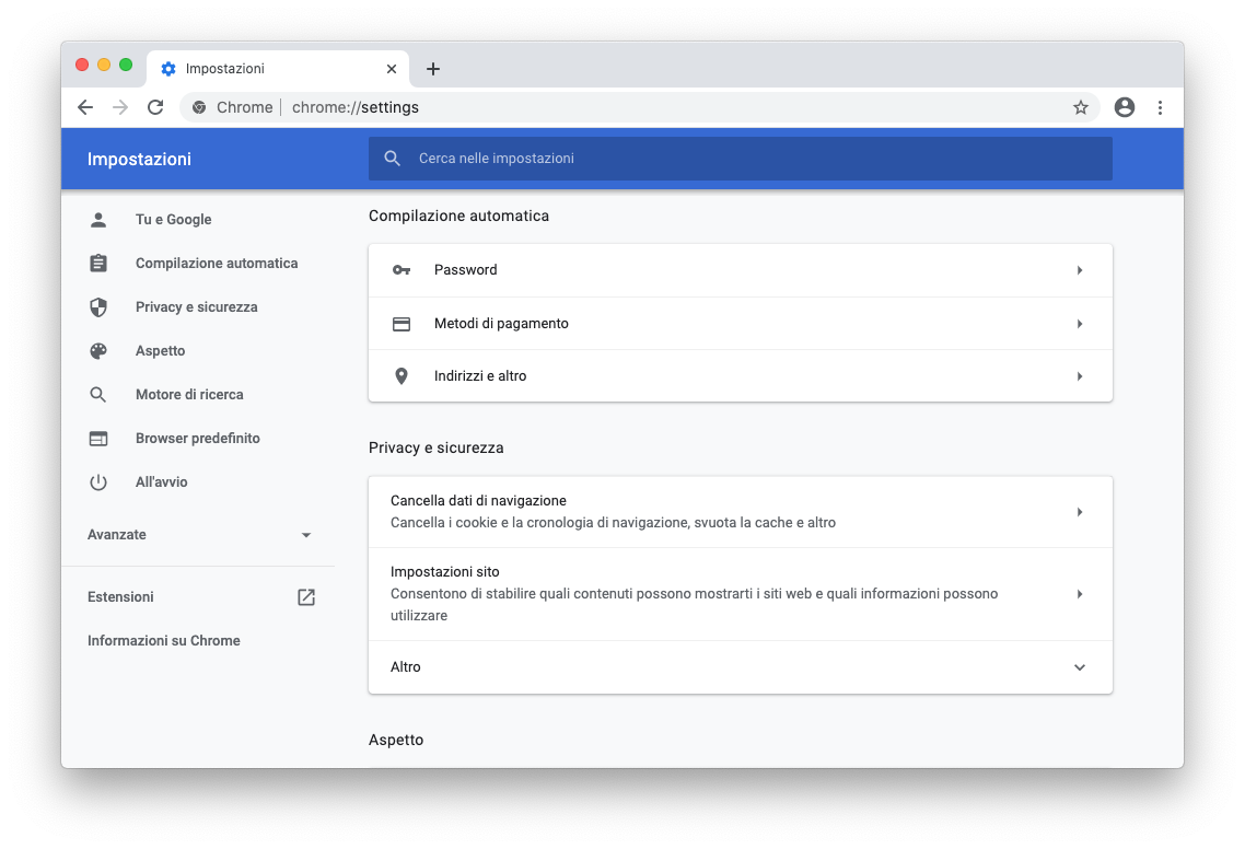 Chrome offre anche una casella per eseguire una ricerca nelle impostazioni: se non trovi la voce che ti serve, puoi digitarla nel campo di inserimento “Cerca nelle impostazioni” e il browser la troverà e la metterà in evidenza.
