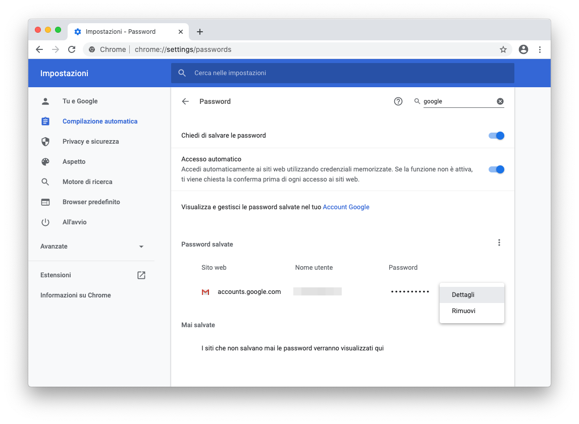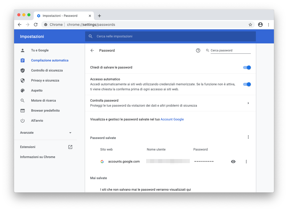 Stiamo qui parlando delle password salvate localmente in Google Chrome sul Mac, non di quelle archiviate e sincronizzate nell’account Google.