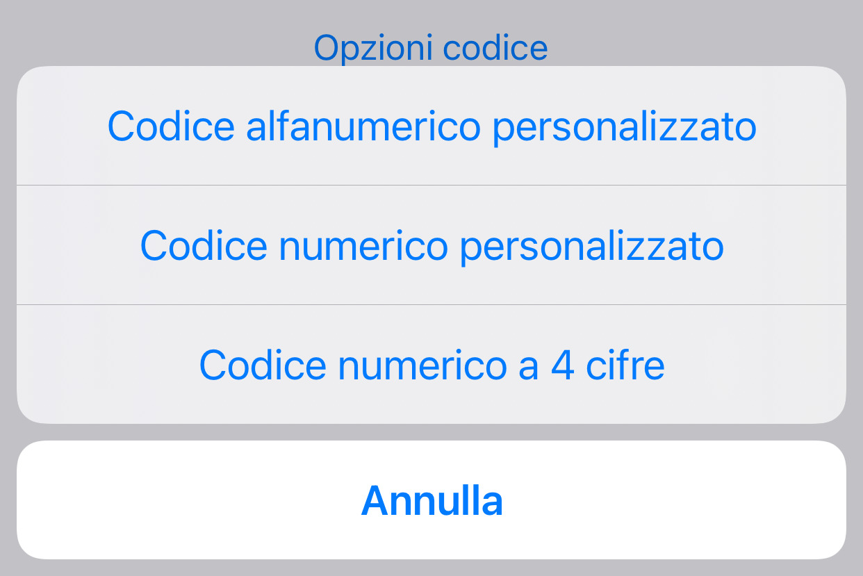 Le tre opzioni sono: Codice alfanumerico personalizzato, Codice numerico personalizzato e Codice numerico a 4 cifre. Come è facile intuire, le prime due sono più robuste e, dal punto di vista della sicurezza, preferibili alla terza.