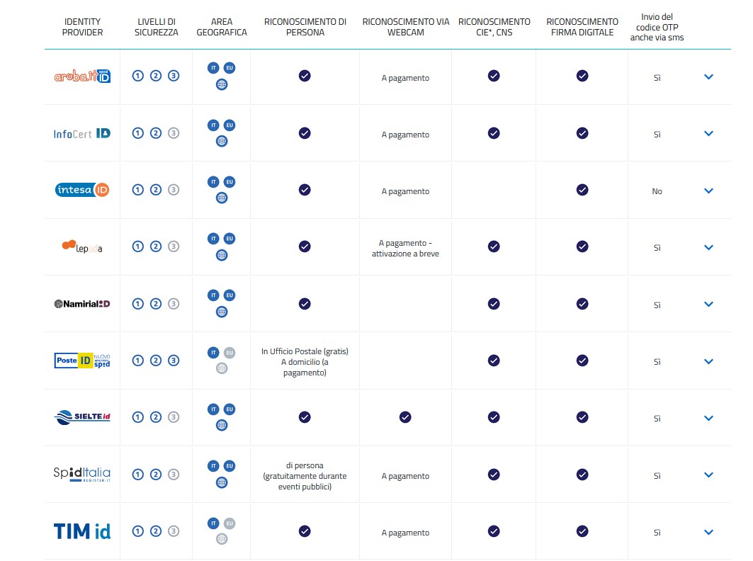Il sito di AGID, riporta l’elenco degli Identity Provider. Nel momento in cui scriviamo sono 8 e tutti erogano gratuitamente lo SPID, se l’identificazione avviene di persona, oppure tramite CNS o firma digitale. Quasi tutti offrono, a pagamento, identificazione via webcam. Poste Italiane si spinge ad offrire sistema di identificazione a domicilio: un servizio probabilmente di nicchia, ma importante per persone anziane e con scarsa dimestichezza con gli strumenti tecnologici.