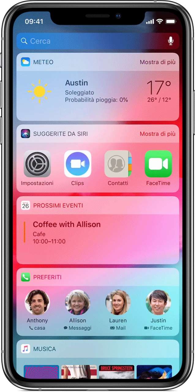 Oltre che dall’app Telefono, possiamo accedere alla lista dei Preferiti, in modo ancora più rapido, dalla vista Oggi di iPhone, grazie ai widget personalizzabili.