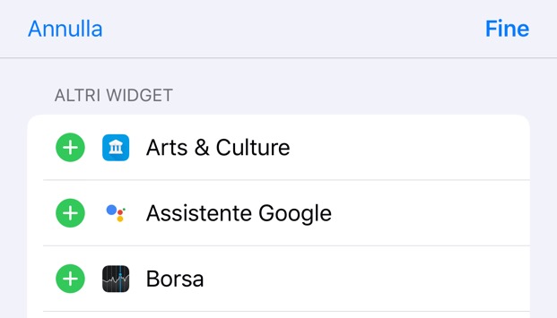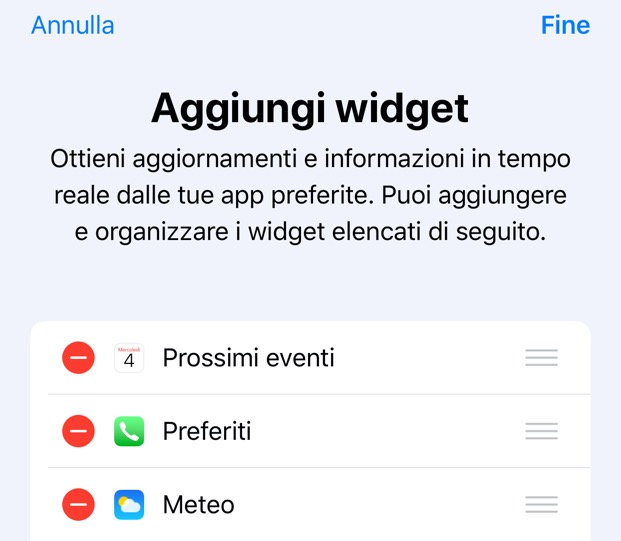 iOS mostra la lista dei widget disponibili, da cui puoi selezionare sia quelli da rimuovere che quelli da aggiungere alla vista Oggi, oltre che riorganizzare l’ordine con cui i widget vengono visualizzati.