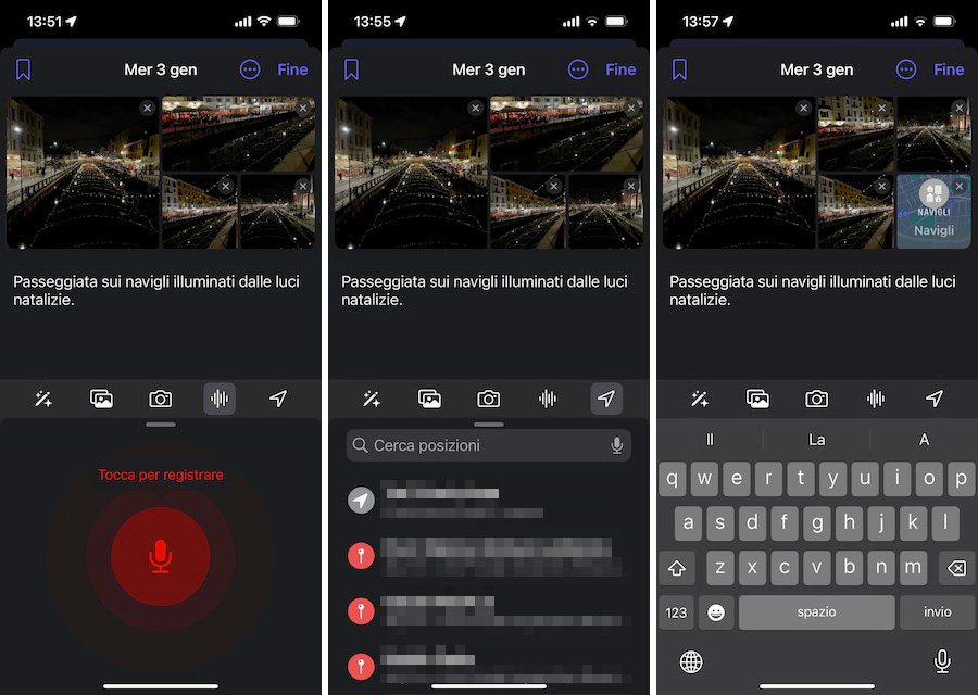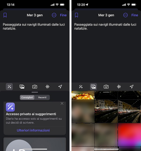 Possiamo selezionare più foto (o video): man mano che procediamo con la selezione, se è visibile sia il pannello che l’annotazione, vediamo che l’app Diario aggiunge le foto al contenuto, organizzando automaticamente l’impaginazione.