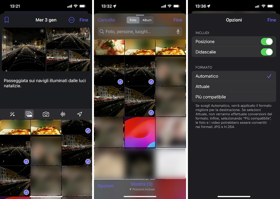 Toccando Opzioni, possiamo scegliere se includere, insieme alle foto, anche la Posizione e le Didascalie. Inoltre, possiamo scegliere che formato l’app Diario debba utilizzare per inserire le foto e i video nell’annotazione.