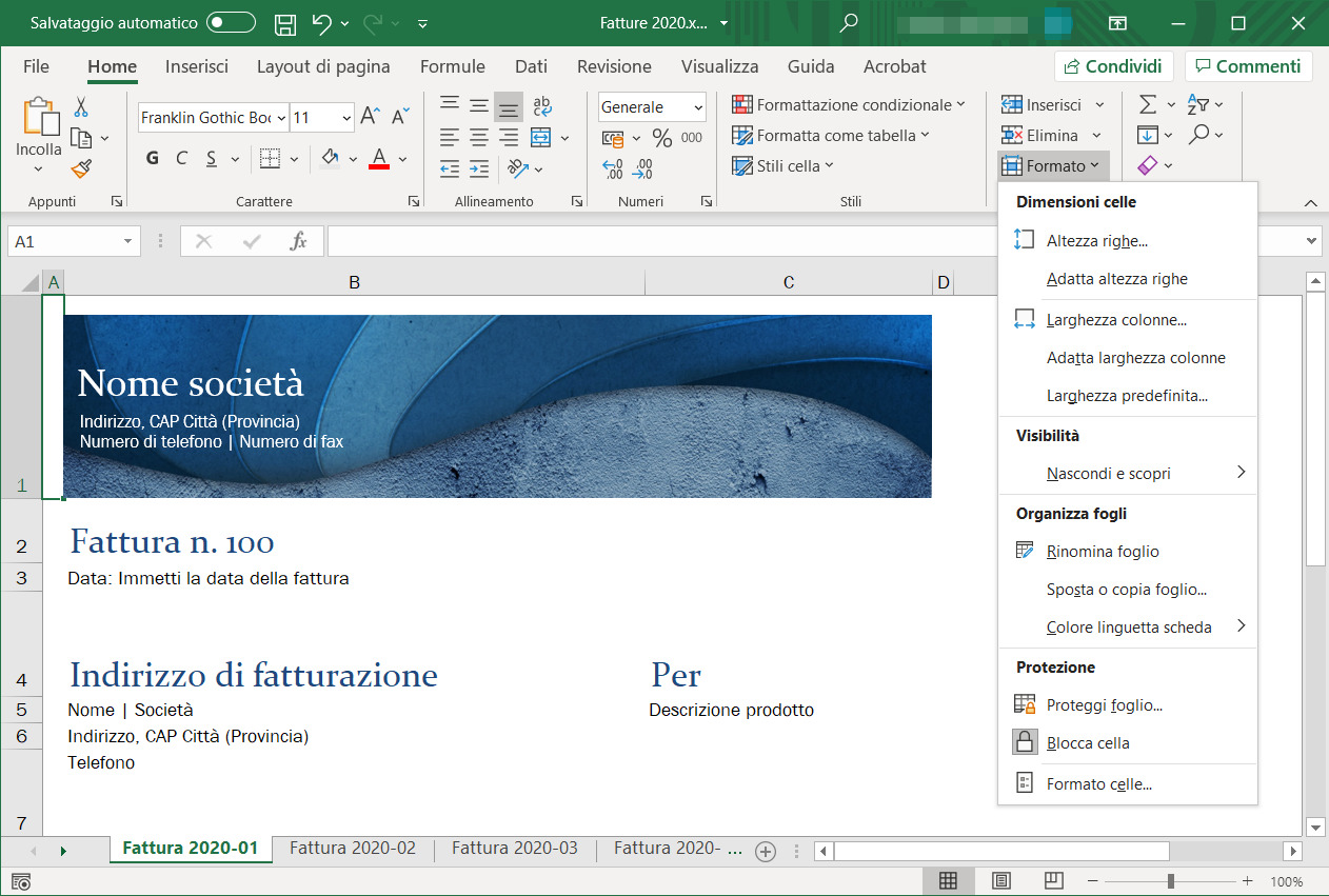 Un’alternativa che potrebbe risultare più comoda è quella di selezionare il foglio da spostare e fare clic su Formato > Sposta o copia foglio nel tab Home della barra multifunzione. In alternativa, puoi fare un clic destro sulla linguetta del foglio e selezionare il comando Sposta o copia.