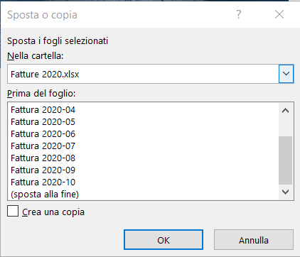 Nella finestra di dialogo Sposta o copia puoi scegliere con precisione la posizione in cui spostare il foglio selezionato, nella casella Prima del foglio. C’è anche una pratica opzione (sposta alla fine) che ti permette di spostare direttamente il foglio come ultimo nella cartella di lavoro.