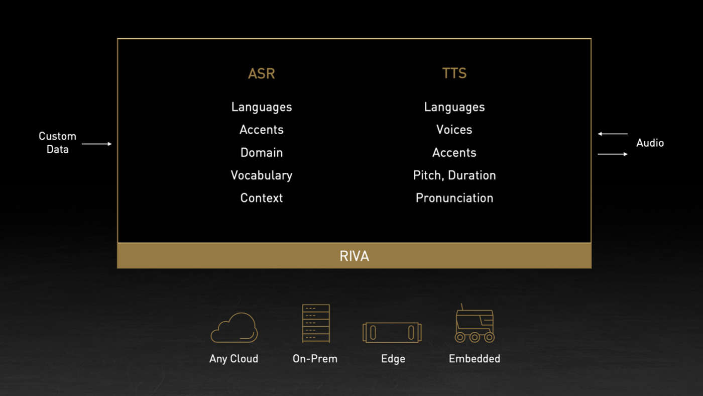 L’SDK Riva include funzioni di riconoscimento vocale automatico e di text-to-speech di livello enterprise che sono personalizzabili per diversi accenti e domini. Fornisce anche la possibilità di scalare i servizi vocali a centinaia di migliaia di flussi nel cloud, nel data center o sull’edge.