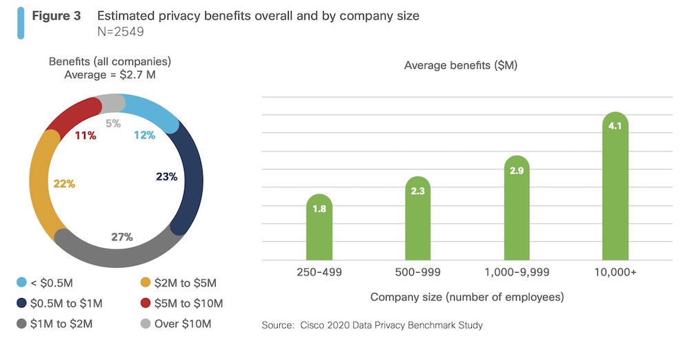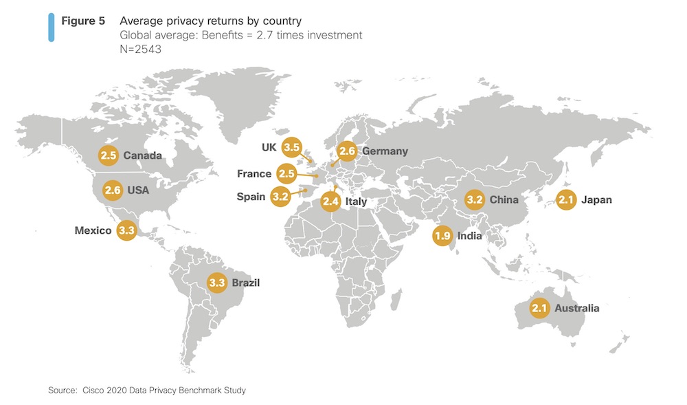 Tra le risultante chiave dello studio, emerge che, per ogni dollaro speso per la privacy, l’organizzazione media ottiene 2,70 dollari in benefici associati. Cisco ha chiesto agli intervistati di quantificare il loro investimento annuale in termini di privacy e i business benefit, e ha utilizzato questi valori per calcolare il ROI sulla privacy.