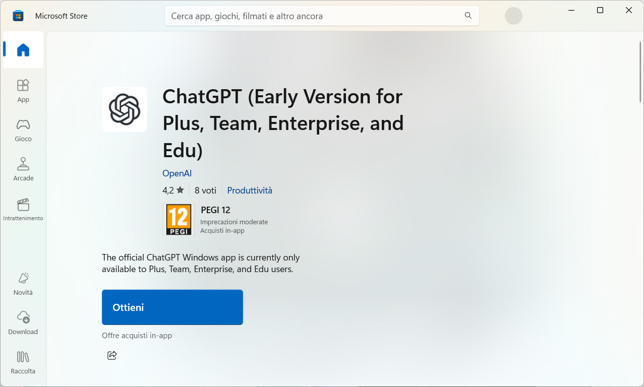 È possibile scaricare l’applicazione per Windows ufficiale di OpenAI dal Microsoft Store, anche quello italiano, e possiamo visualizzarne la scheda nell’app desktop dello Store.