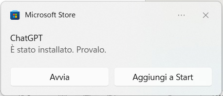 Dunque, dopo aver fatto clic su Ottieni nella scheda dell’applicazione nell’app Microsoft Store, Windows avvia il download e poi si occupa di installare ChatGPT, come di consueto per le app scaricate dallo Store.