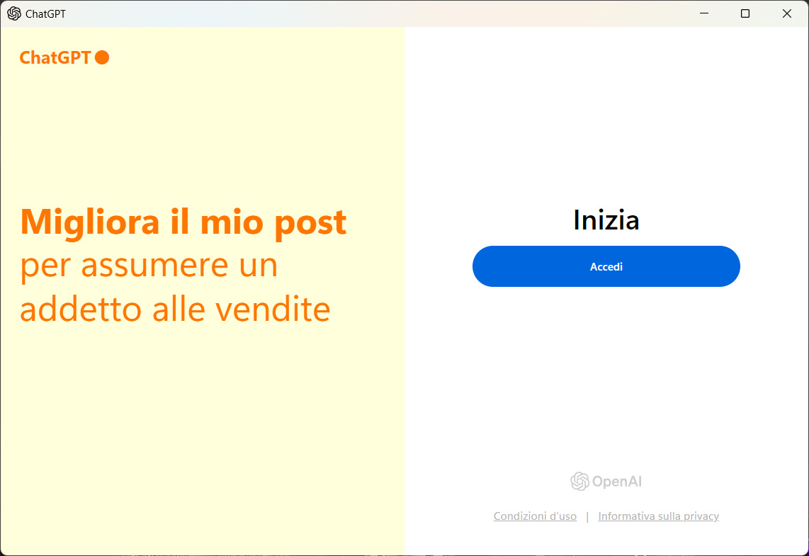 Al primo avvio dell’applicazione, ChatGPT ci chiede di eseguire l’accesso. Nella schermata di benvenuto, troviamo anche i link per consultare i termini di utilizzo e l’informativa sulla privacy: informazioni che è sempre una buona idea approfondire, prima di utilizzare un nuovo software o un servizio.