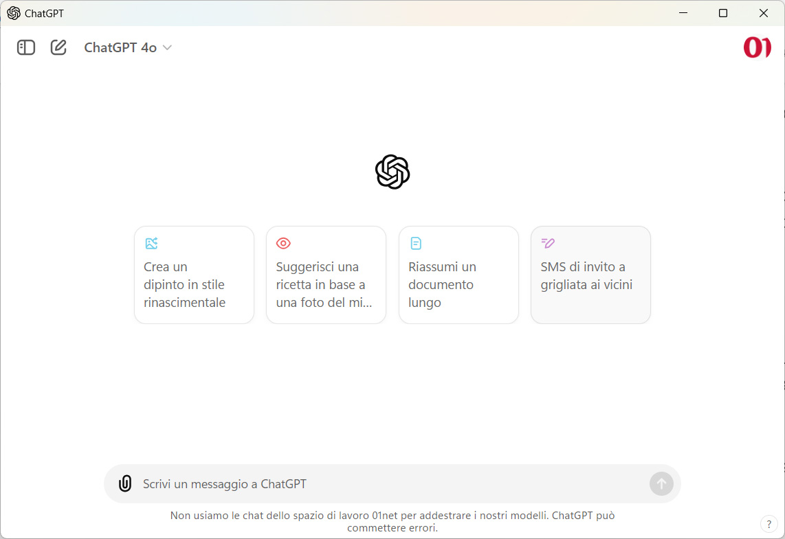L’interfaccia è quindi quella familiare, con la barra laterale sinistra comprimibile ed espandibile a piacimento, tramite il pulsante nell’angolo in alto a sinistra. Nella parte superiore della finestra troviamo come di consueto anche l’icona per creare una nuova chat e il menu di selezione del modello (GPT-4o è naturalmente incluso)