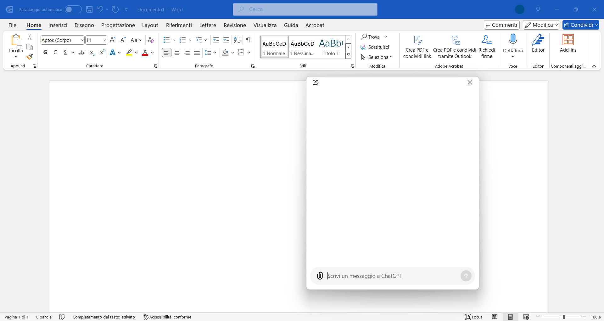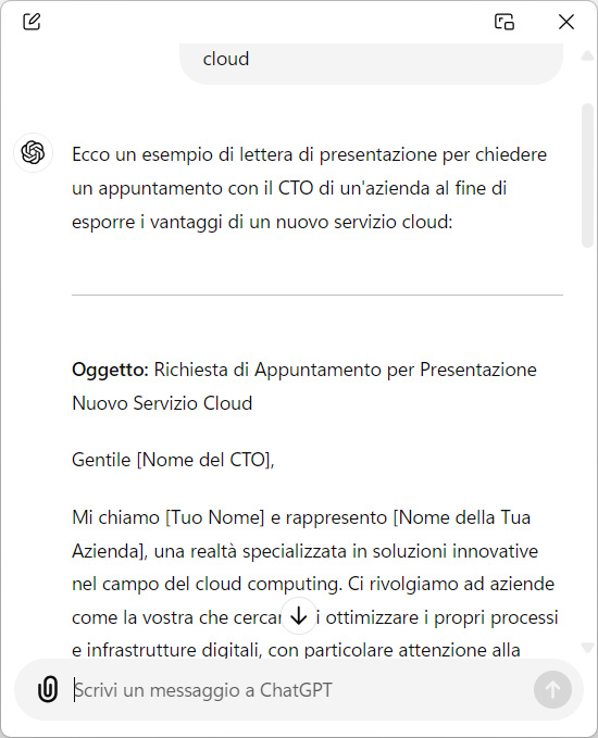 Nella finestra flottante possiamo utilizzare la casella di testo del prompt per inviare richieste, leggere e copiare le risposte dell’AI, ripulire il contenuto della finestra creando una nuova chat.