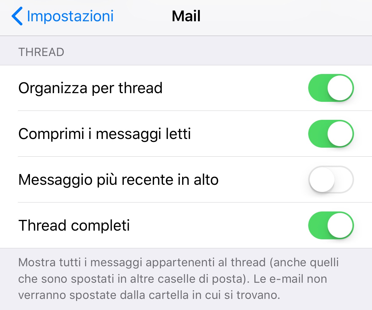 Tutte queste opzioni di configurazione sono accessibili in Impostazioni > Mail, nella sezione intitolata, per l’appunto, Thread.