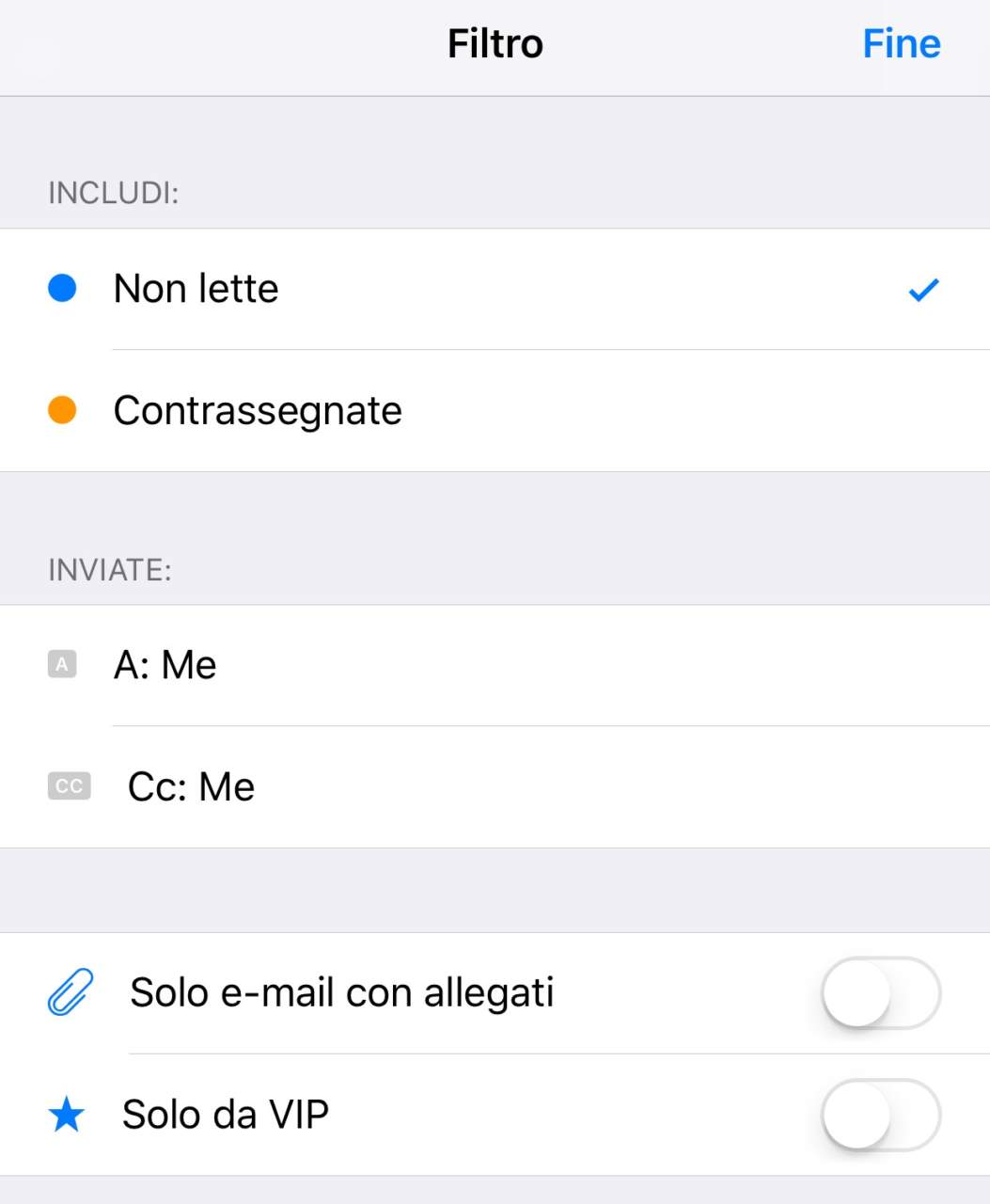 Di default, il filtro mostra solo le mail non lette. Toccando Filtra per: Non lette si passa a una schermata che permette di impostare filtri diversi. Tra le altre opzioni: mail Contrassegnate, mail per cui siamo destinatari espliciti o in copia (Inviate A: Me, Cc:Me). E ancora: Solo e-mail con allegati e Solo da VIP (mail inviate da mittenti VIP).