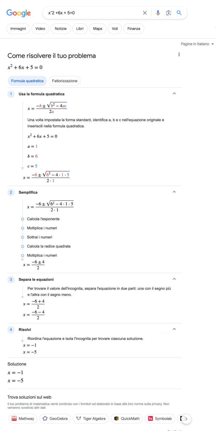 Come si vede dall’immagine, Google è in grado di recepire la richiesta, elaborarla e restituire la soluzione. Ma non solo: aprendo i vari menù a tendina numerati presenti sulla destra sotto l’equazione, è possibile trovare un’accurata spiegazione di come questa è stata risolta.