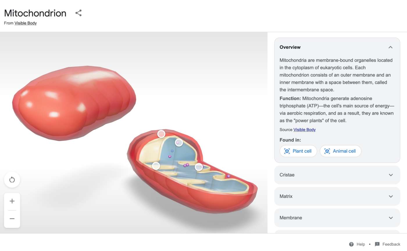 Una volta fatta una specifica ricerca su Google – in questo esempio viene visualizzato un mitocondrio – è necessario scorrere la pagina finché non si trova il modello 3D. A questo punto si possono fare più cose: osservare esternamente e internamente le sue componenti a 360 gradi ingrandendo e rimpicciolendo il modello, leggere le definizioni delle parti che lo compongono abbassando i vari menù a tendina e, se necessario, fare ulteriori ricerche sulle componenti più piccole per capire ancora meglio e in maniera capillare di cosa si tratta.