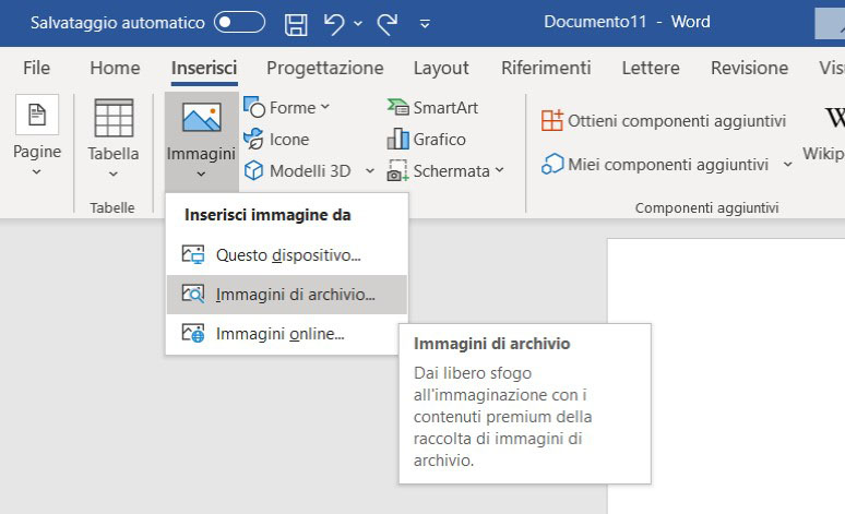 Nella scheda Inserisci della barra multifunzione seleziona prima Immagini e poi Immagini di archivio.