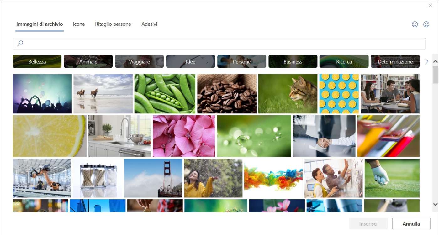 Si aprirà la finestra che consente di sfogliare i contenuti o ricercare all’interno della libreria d’immagini di Microsoft 365. Questa è suddivisa in quattro sezioni: Immagini di archivio, Icone, Ritaglio persone (con immagini di persone scontornate dallo sfondo) o Adesivi. Dei tag ti consentono di filtrare i contenuti visualizzati e puoi anche usare la casella di ricerca per trovare le immagini in base a parole chiave.