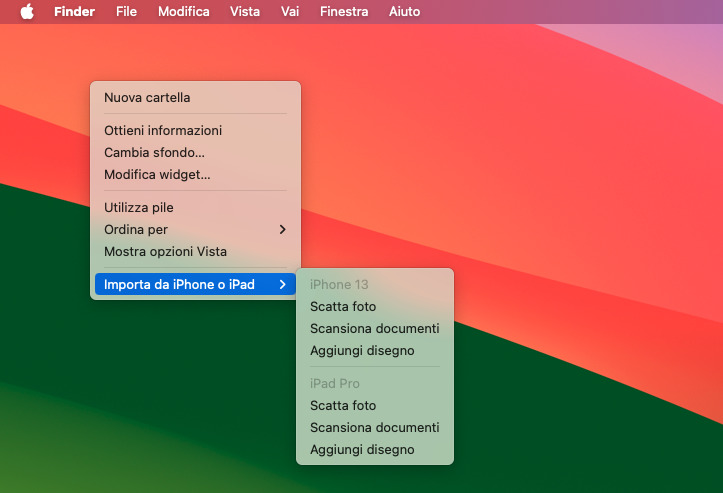 Il Mac visualizza un menu contestuale, da cui selezioniamo Importa da iPhone o iPad. La voce di menu potrebbe essere anche solo Importa da iPhone (o da iPad), a seconda dei dispositivi che macOS ha rilevato e identificato come disponibili per questa funzionalità.