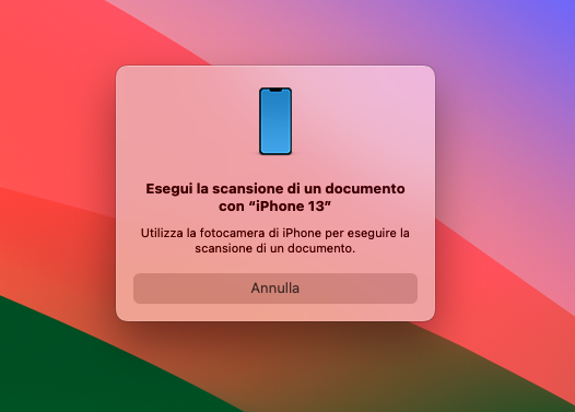 A questo punto, sul Mac appare un messaggio di attesa, che ci invita a eseguire la scansione del documento utilizzando la fotocamera integrata di iPhone.