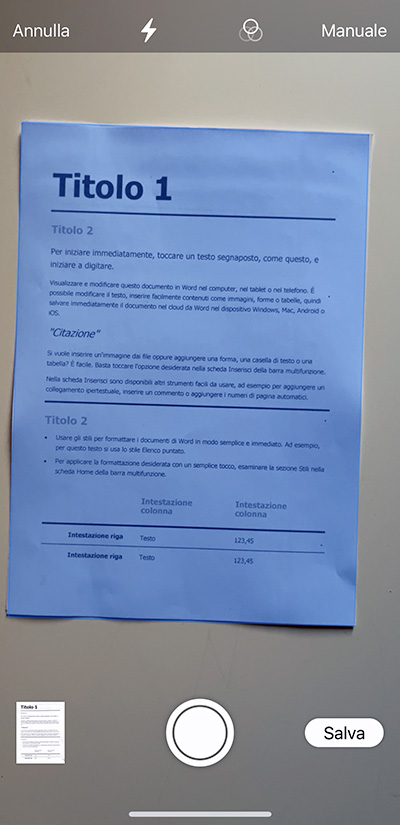 Su iPhone, iOS mostra l’interfaccia di Fotocamera, già in modalità di acquisizione: questa può essere fatta in modalità automatica (che si occupa di riconoscere, definire l’area e inquadrare il documento, e di scattare, il tutto automaticamente) o manuale, toccando il pulsante otturatore. Possiamo anche eseguire più scansioni in una stessa attività di acquisizione, per documenti con più pagine.